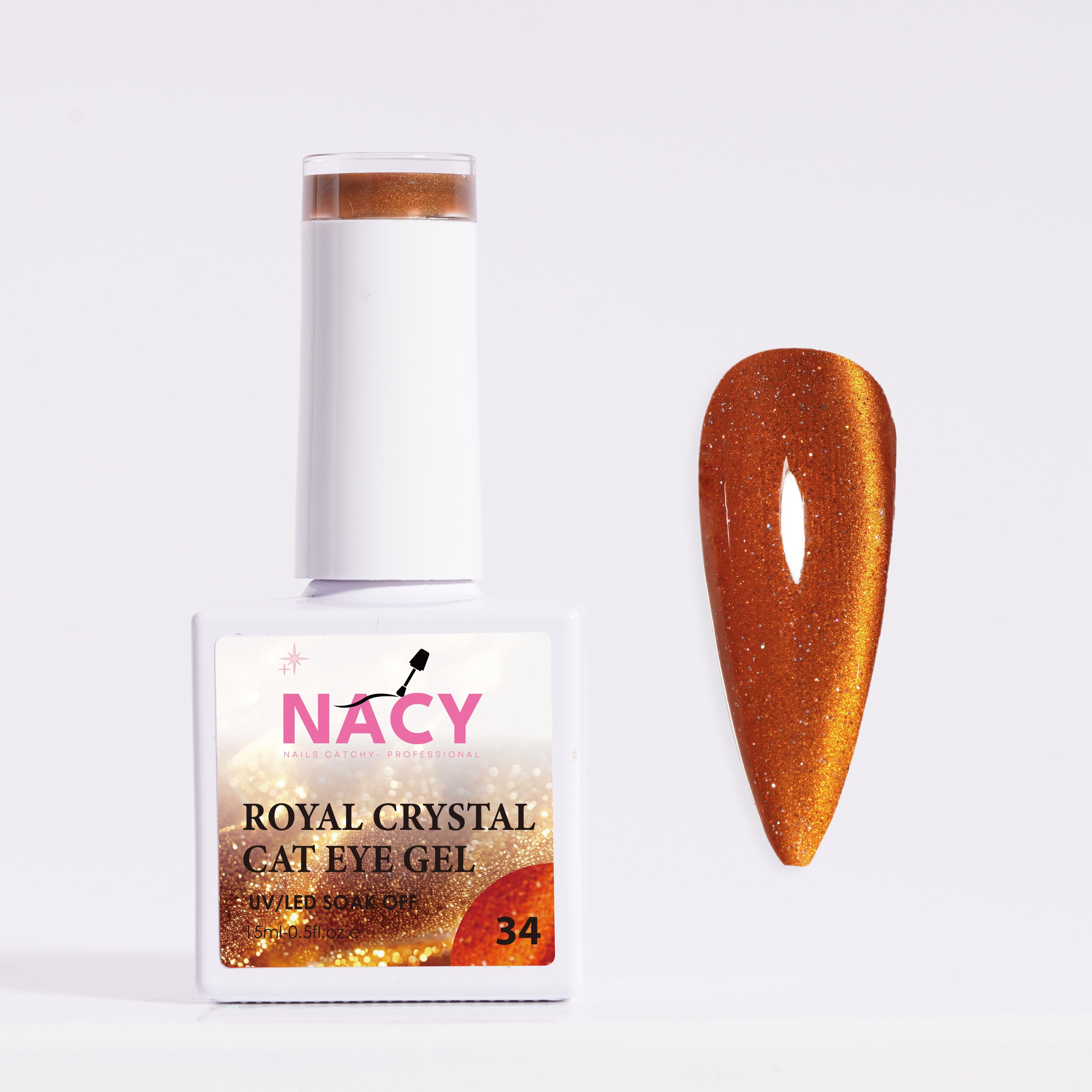 The Nacy Royal Fall Cat Eye Moonlight Crystal Color is a stunning collection of 36 luxurious gel nail polishes, designed to captivate with their unique cat eye effect and shimmering crystal finish. Inspired by the rich hues of autumn, this range features a sophisticated palette of golden, amber, and bronze tones, blended with subtle iridescent sparkles that catch the light like moonlight on a fall evening. Each shade, numbered from 001 to 036, offers a glossy, almond-shaped nail swatch that showcases the depth and dimension of the cat eye effect, created using a special magnetic technique to draw out mesmerizing patterns. Perfect for those seeking to express their individuality, this Royal Crystal Cat Eye Gel line combines fashion, personality, and a radiant shine, making it an ideal choice for creating elegant, eye-catching manicures.