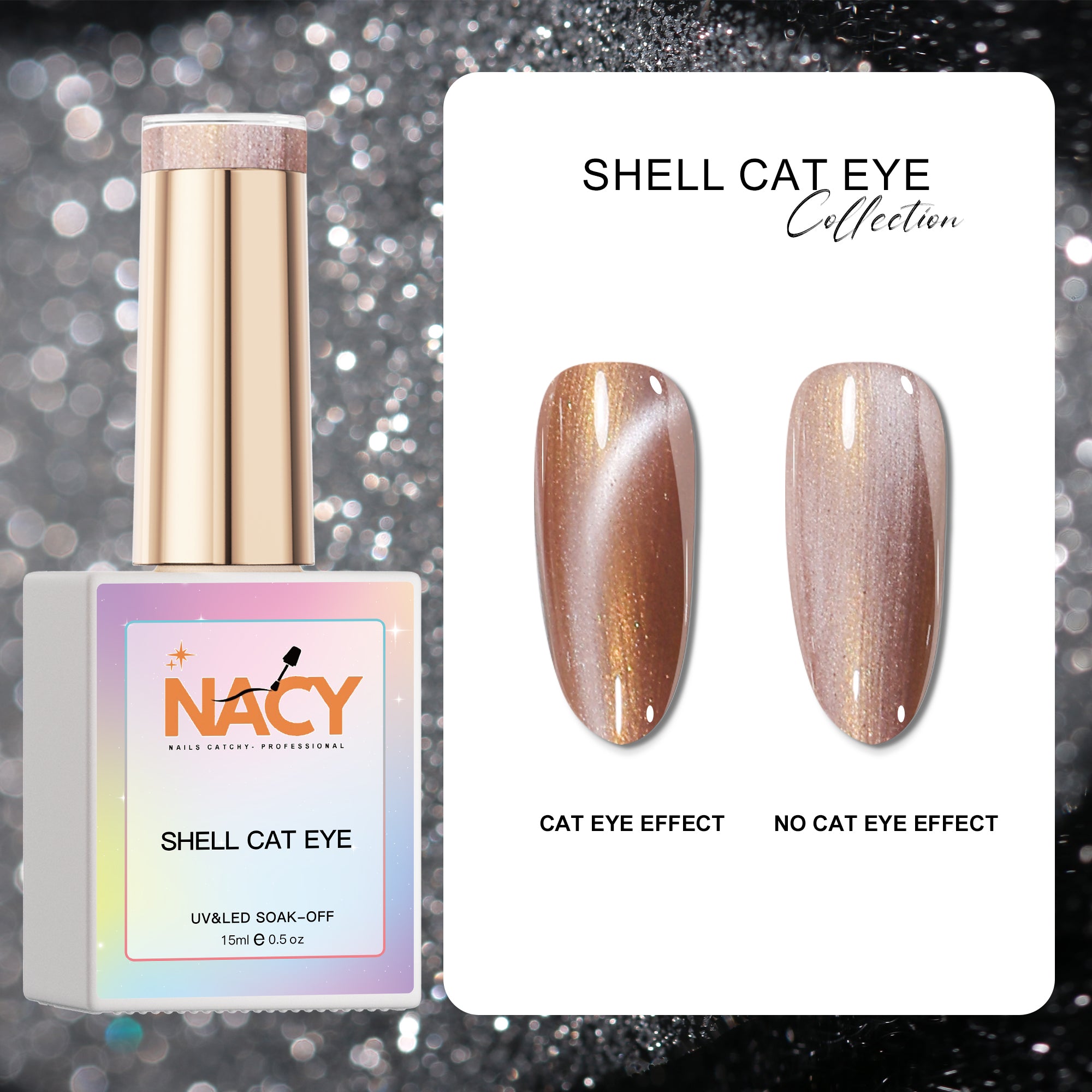 The Nacy Aurora Shell Cat Eye Gel Polish collection features 24 stunning shades in 0.5oz bottles, designed to create a captivating, iridescent cat eye effect with a shell-like shimmer. This high-quality gel polish offers a unique 3D magnetic finish that shifts and glows under light, blending aurora-inspired hues with a natural, pearl-like texture. Perfect for nail art enthusiasts, the long-lasting formula provides smooth application and chip-resistant wear for up to 21-28 days when cured under a UV/LED lamp. Ideal for creating mesmerizing designs over dark bases or as a standalone translucent look, this cruelty-free, low-odor polish is a must-have for both salon professionals and DIY manicures. Elevate your nail game with the Nacy Aurora Shell Cat Eye collection and enjoy a radiant, eye-catching manicure!