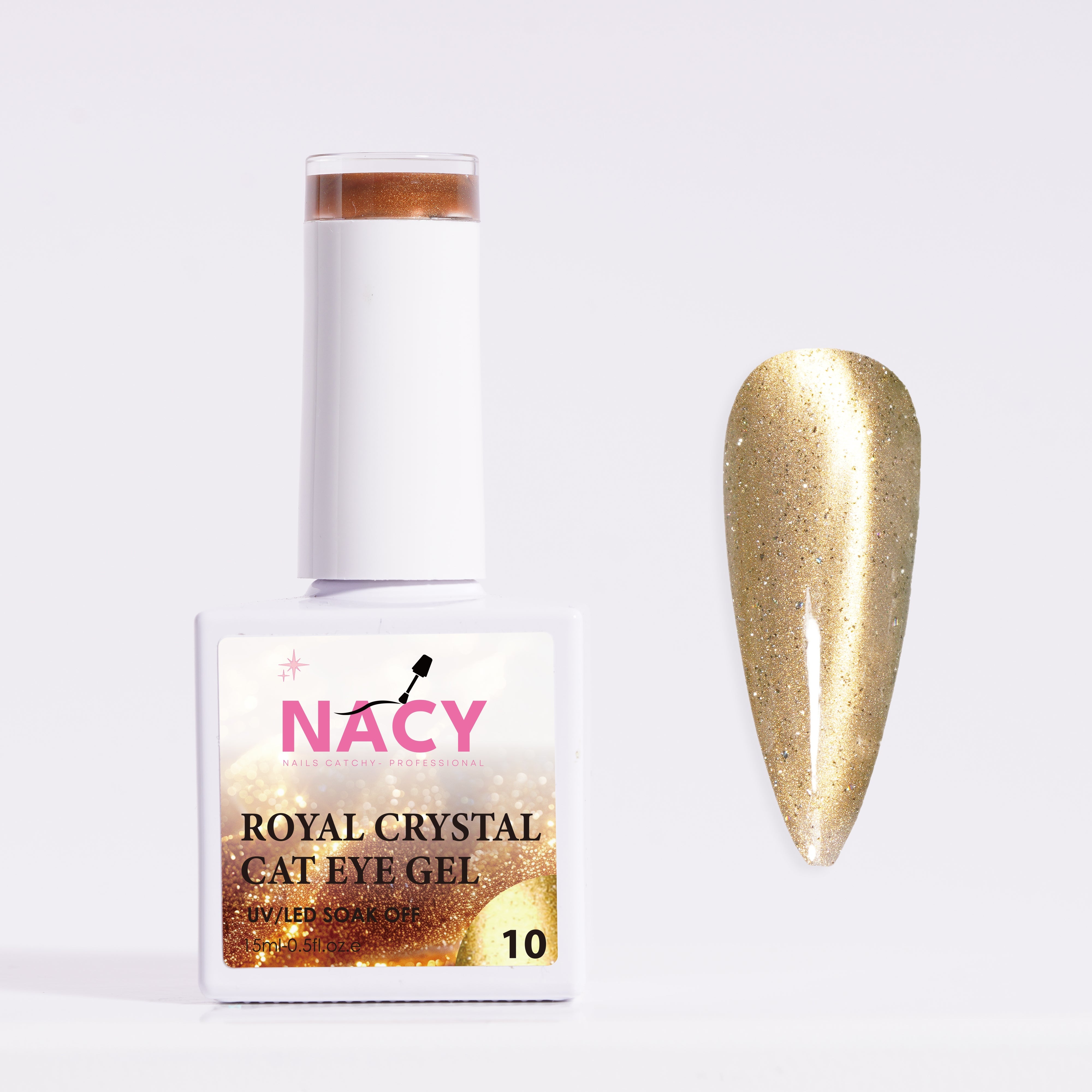 The Nacy Royal Fall Cat Eye Moonlight Crystal Color is a stunning collection of 36 luxurious gel nail polishes, designed to captivate with their unique cat eye effect and shimmering crystal finish. Inspired by the rich hues of autumn, this range features a sophisticated palette of golden, amber, and bronze tones, blended with subtle iridescent sparkles that catch the light like moonlight on a fall evening. Each shade, numbered from 001 to 036, offers a glossy, almond-shaped nail swatch that showcases the depth and dimension of the cat eye effect, created using a special magnetic technique to draw out mesmerizing patterns. Perfect for those seeking to express their individuality, this Royal Crystal Cat Eye Gel line combines fashion, personality, and a radiant shine, making it an ideal choice for creating elegant, eye-catching manicures.